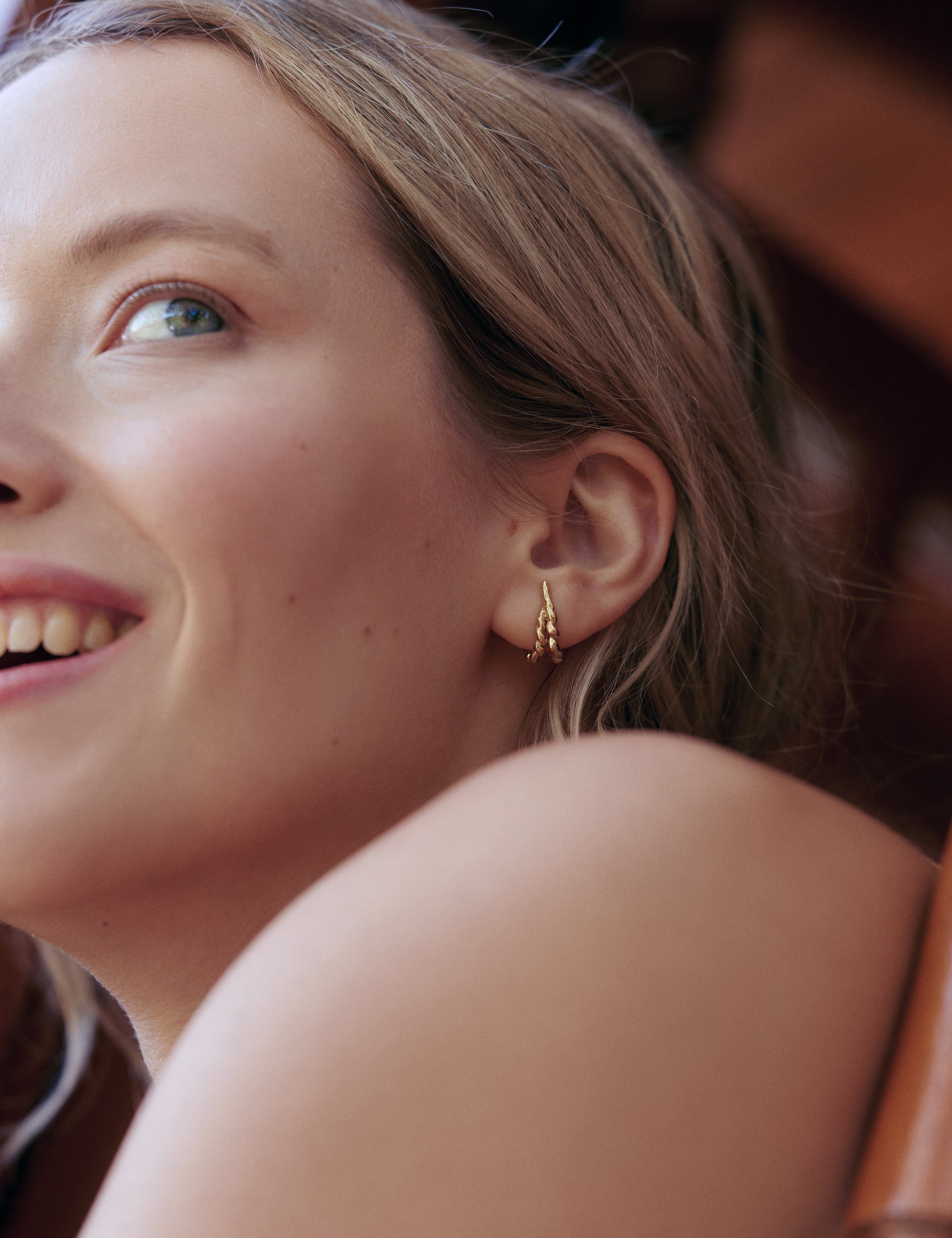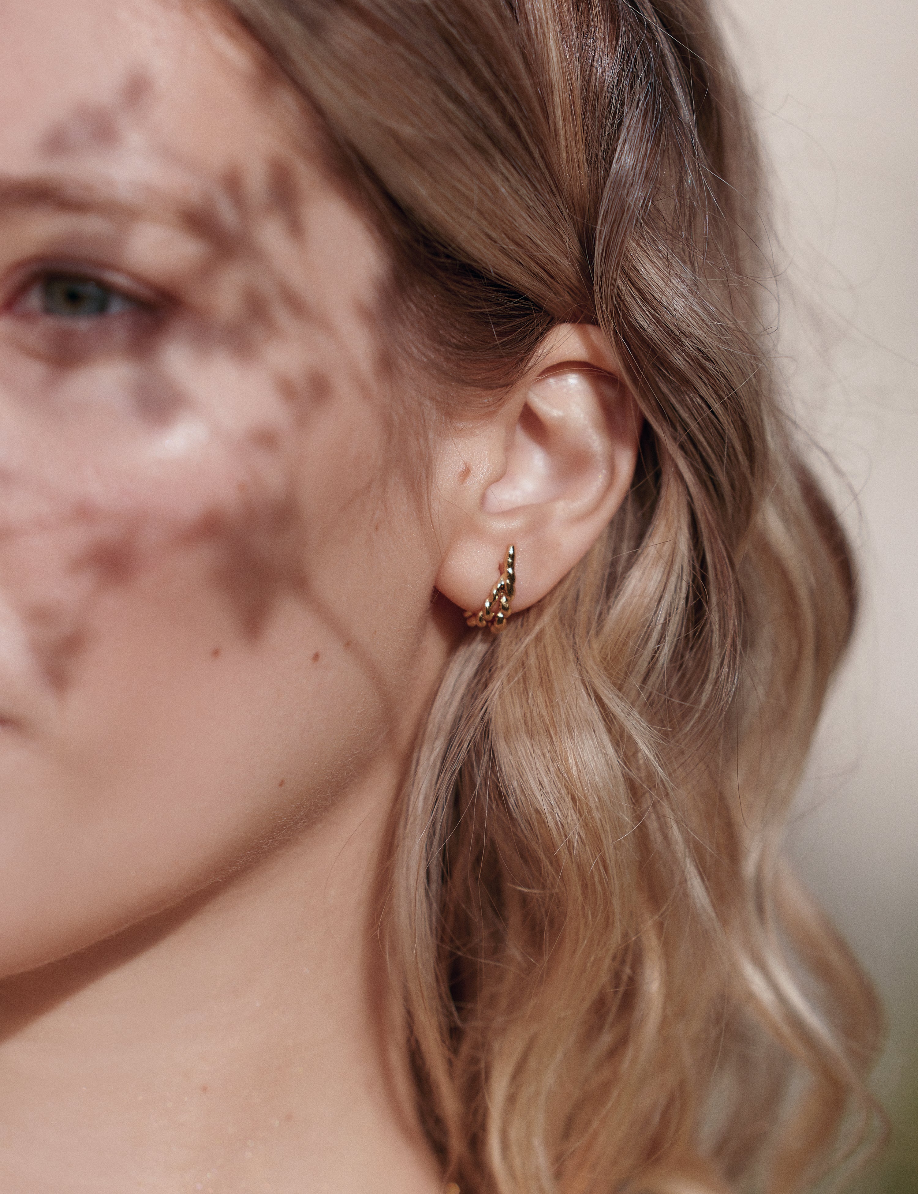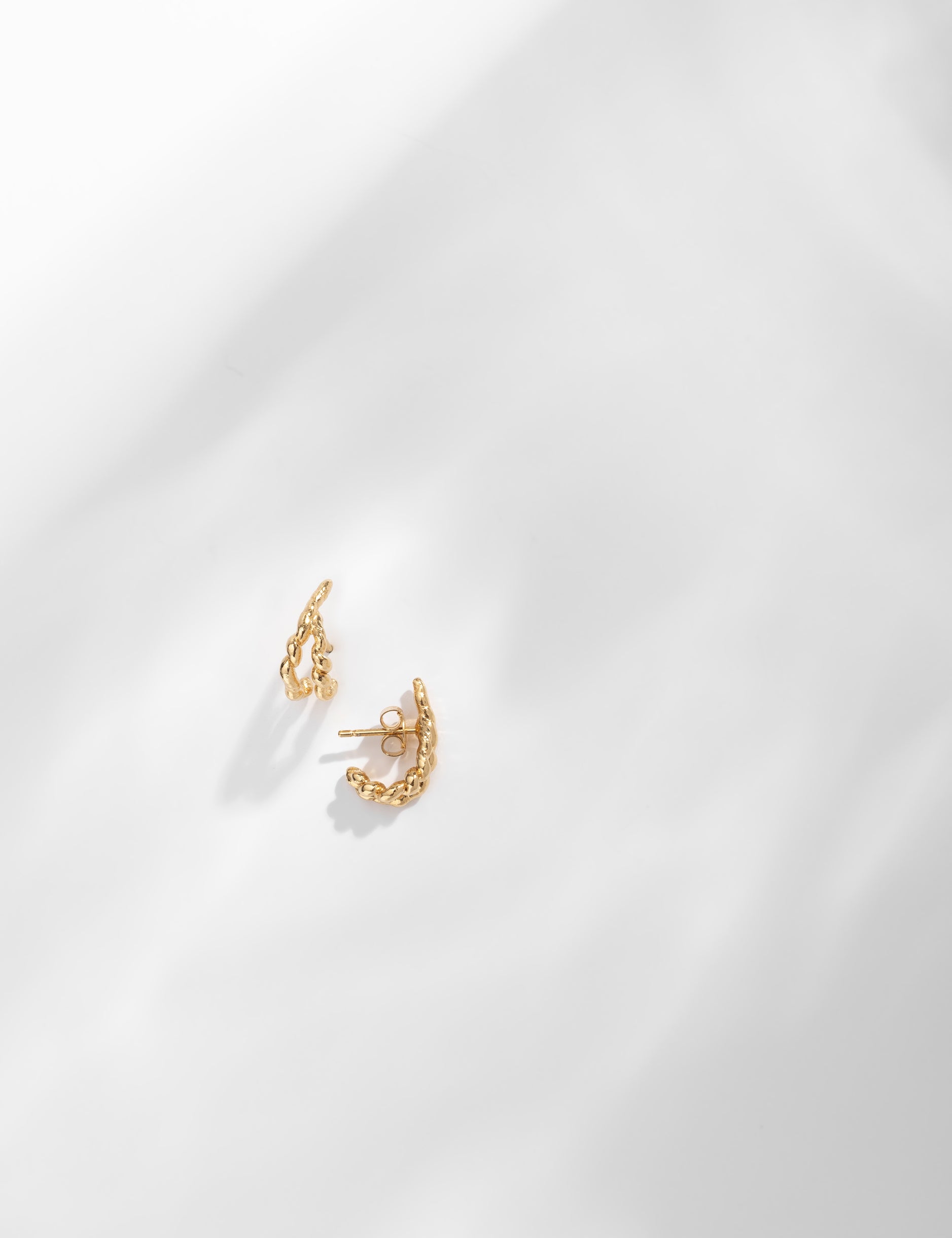 Huggie hoops with fine, irregular twists. They are small in diameter and slightly malleable, designed to sit perfectly on the lobe.