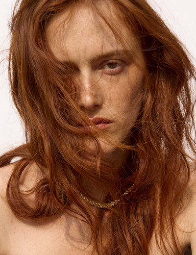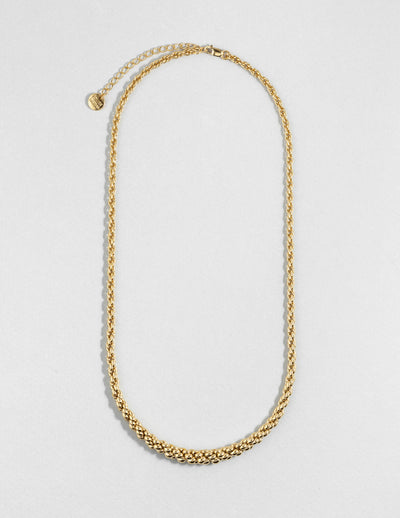 Necklace with rounded links twisted into a spiral. More prominent at the center its volume gradually tapers towards the ends.