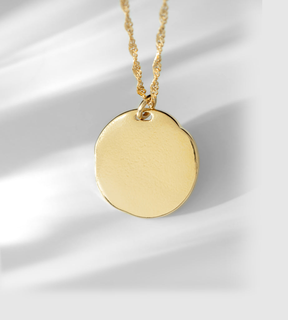 Cette médaille à la forme irrégulière est comme polie par l'eau, et sa chaîne torsadée rappelle le mouvement des vagues. Comme si vous l'aviez trouvée au fond de l'océan...