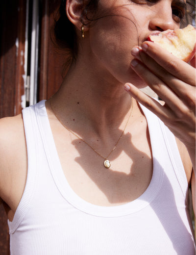 Médaille ovale surmontée d'un cabochon en nacre naturelle, montée sur une chaine fine.