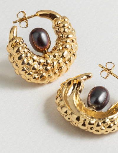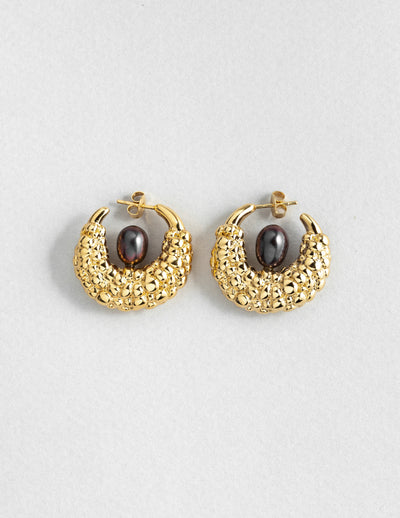 Créoles en croissant à la surface perlée, surmontée d’une perle naturelle noire aux reflets bleutés.