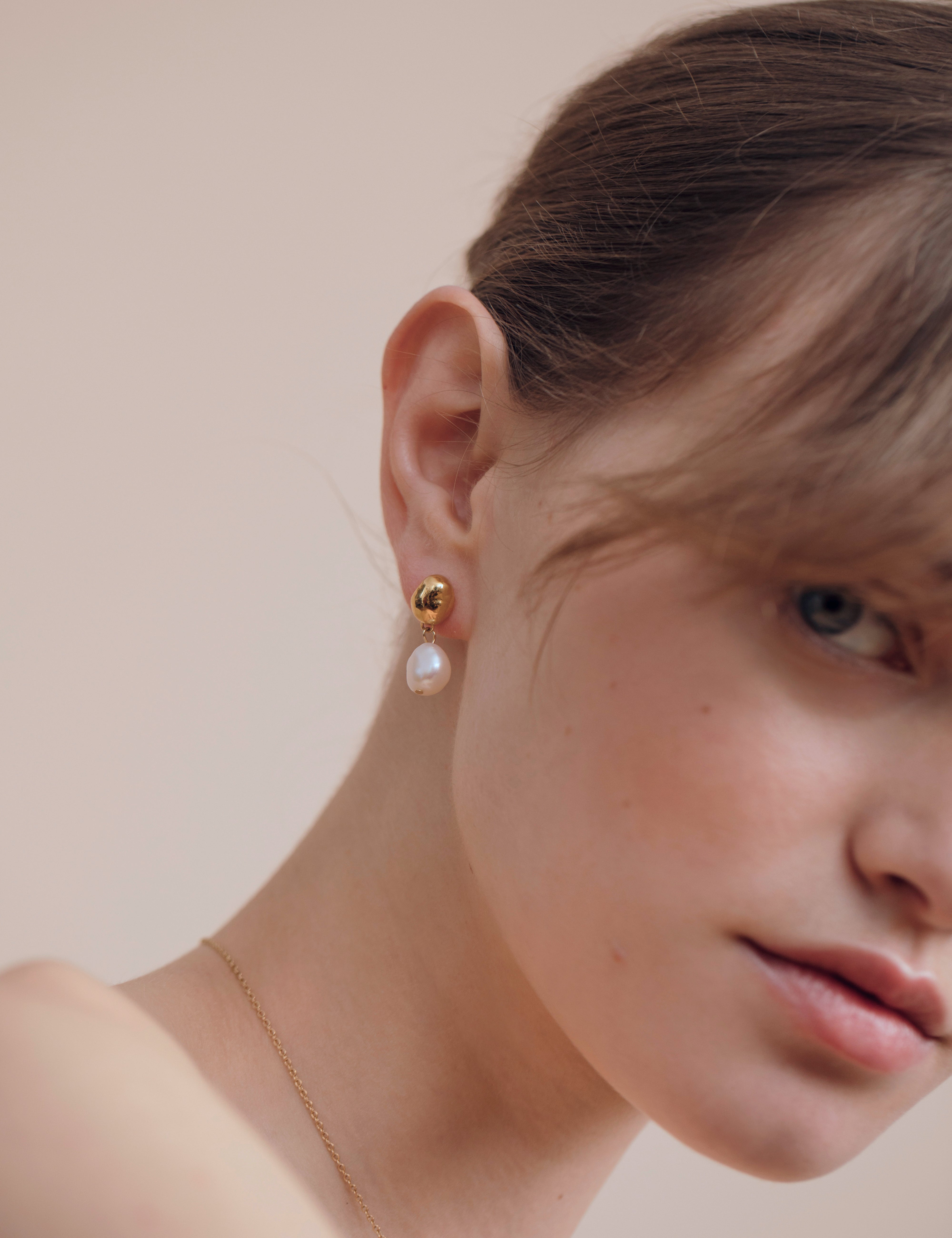 Boucles associant une perle dorée, moulée à partir de véritables perles de nacre, à une perle d’eau douce naturelle, chacune révélant son irrégularité et sa singularité.