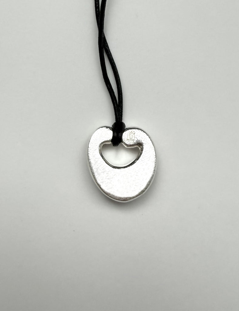 Pendentif aux courbes arrondies, sculpté en volume et ajouré de volutes. Surface lisse et polie. Monté sur un cordon en coton ciré, pour un porté modulable : plus ou moins long, ou doublé.