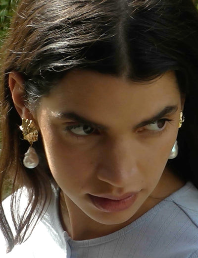 Boucles composées d'un coquillage doré sculpté à partir d'une patelle, et d'une grande perle baroque à l'aspect brut.