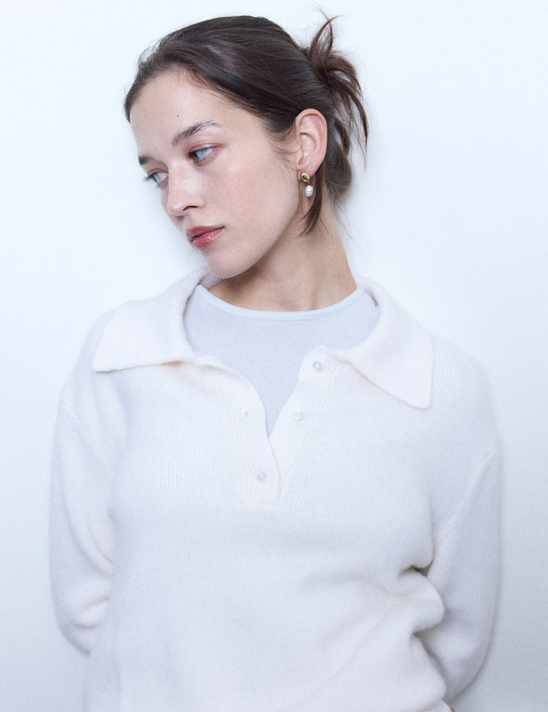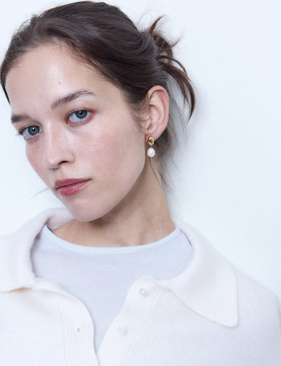 Boucles associant une perle dorée, moulée à partir de véritables perles de nacre, à une perle d’eau douce naturelle, chacune révélant son irrégularité et sa singularité.