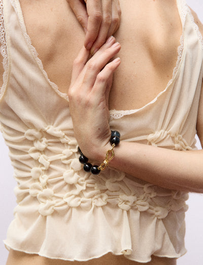 Bracelet en pierre naturelle d'Œil de Faucon, orné d’un fermoir signature en forme de nœud. Une pièce forte, qui habille le poignet à elle seule, à porter sur peau nue ou par-dessus une manche pour en souligner la ligne.