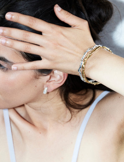 Set de deux joncs aux volumes irréguliers, comme sculptés par la lave. L’un en finition or 24K, l’autre en finition plaqué argent.