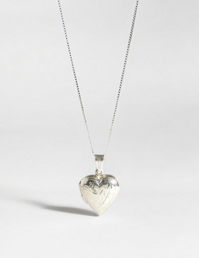Médaillon en argent massif, gravé d’ornementations sur ses deux faces, et monté sur une chaîne fine torsadée.
