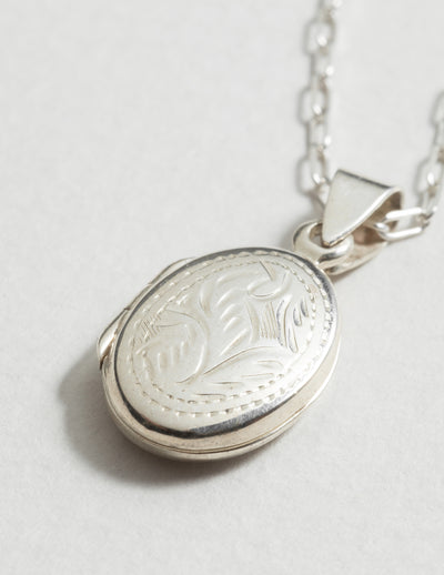 Médaillon en argent massif, gravé d’ornementations sur ses deux faces et monté sur une chaîne à maillons fins rectangulaires.