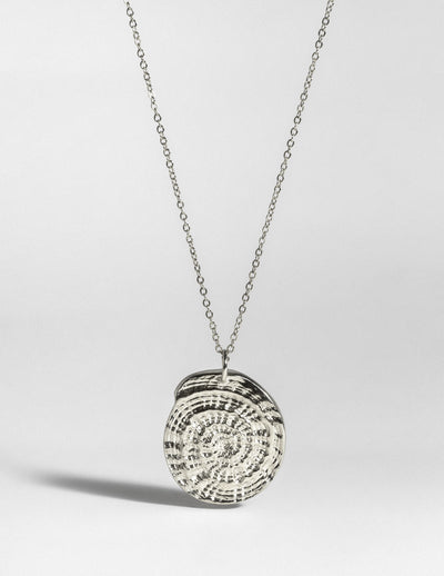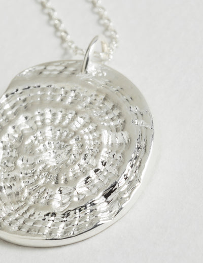 Grande médaille travaillée d’après une empreinte fossile, montée sur une chaine courte.