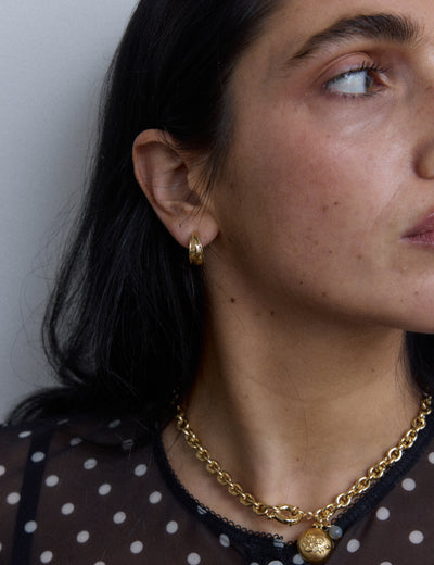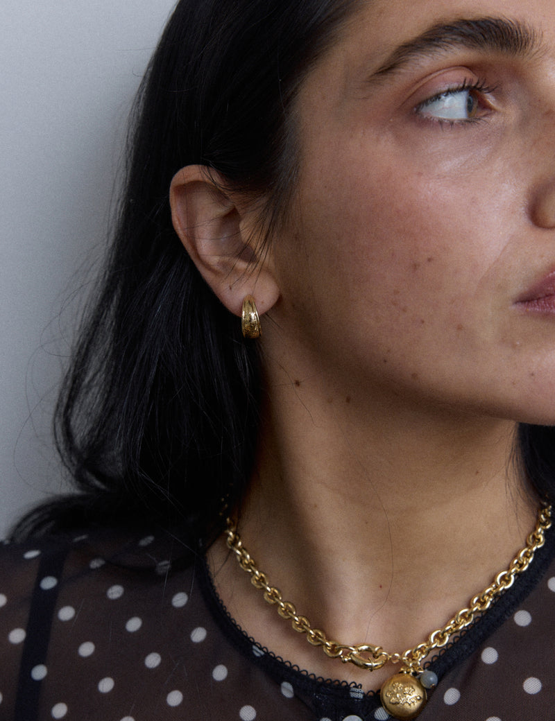Petites créoles légèrement bombées, à la surface texturée.