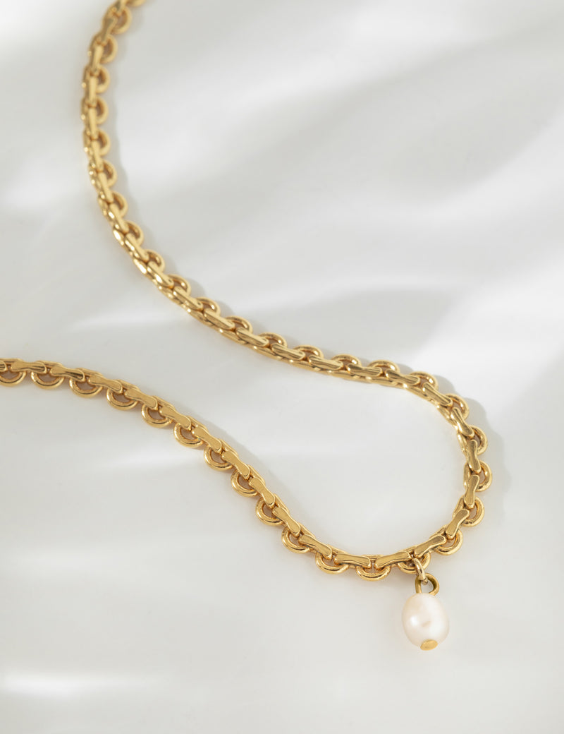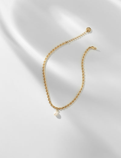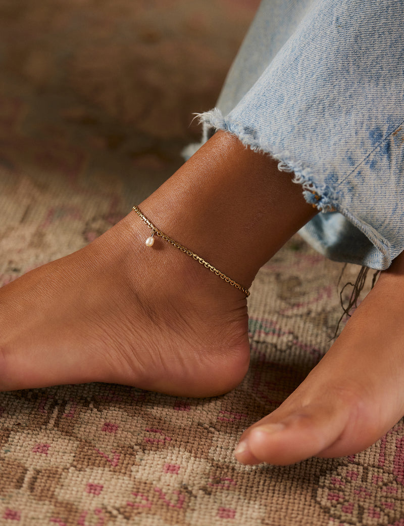 Une jolie chaîne dorée décorée d'une perle d'eau douce, comme un petit-porte bonheur à la cheville.