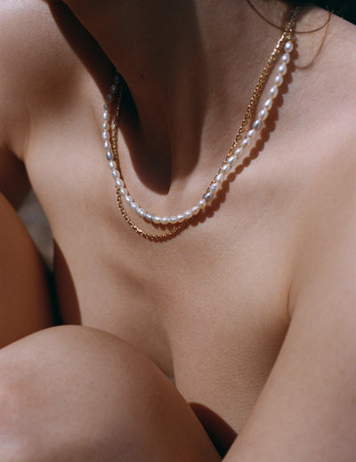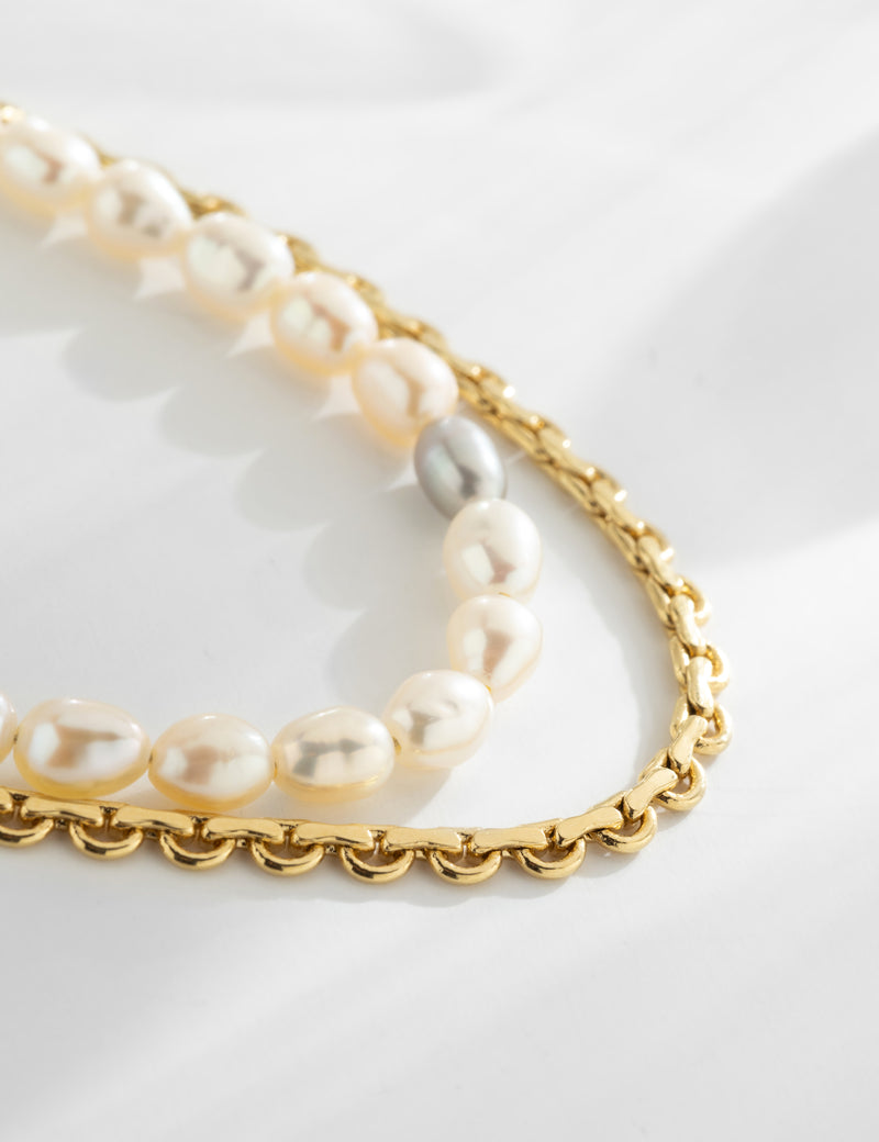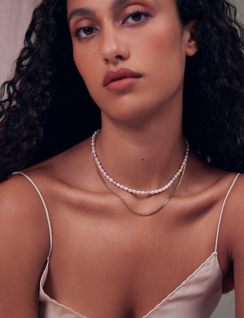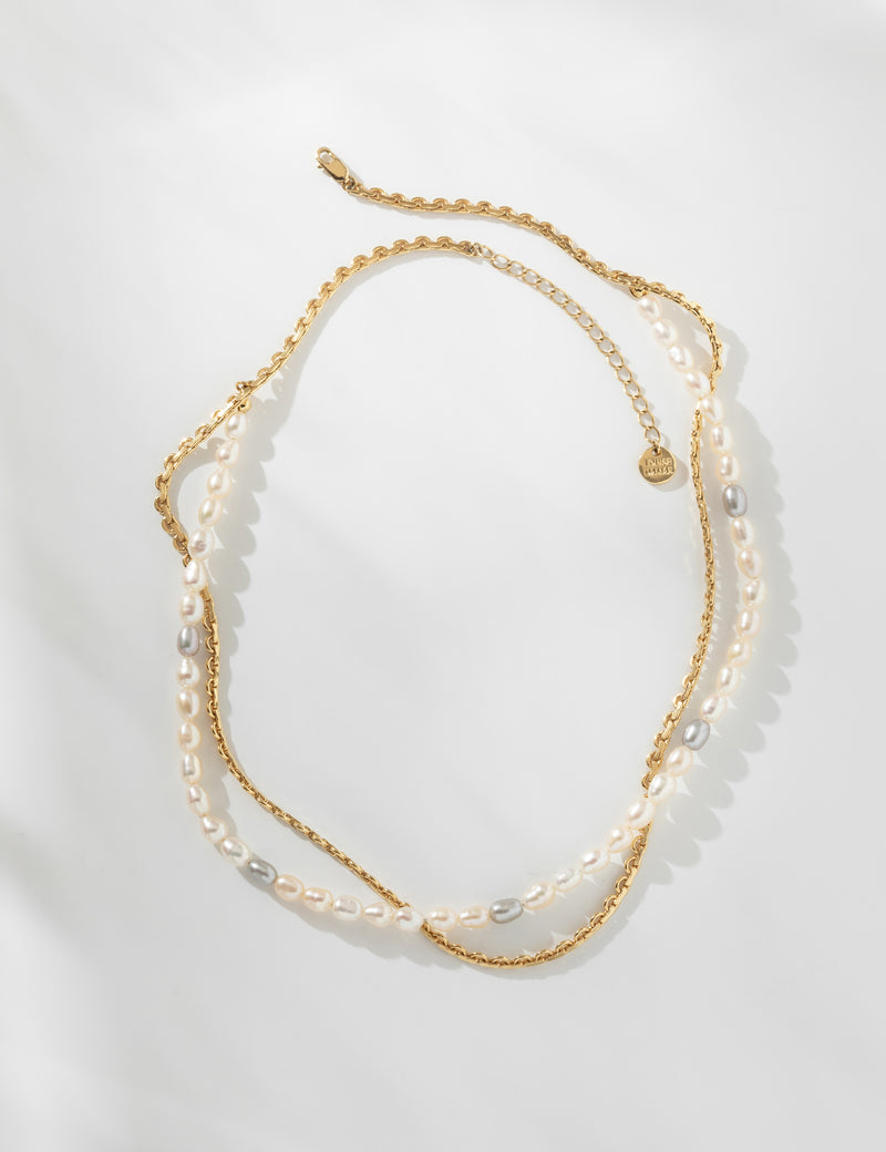 Le traditionnel collier de perles est ici revisité par Louise : un mélange de perles nacrées et gris bleuté, mêlé à une chaîne dorée aux maillons ronds... Une pièce qui reste élégante et précieuse, mais avec une touche de modernité.