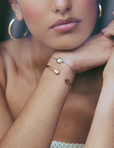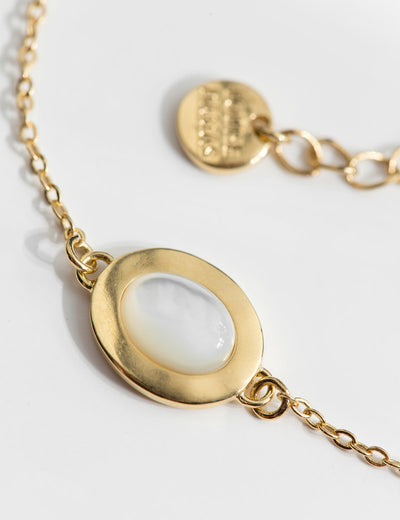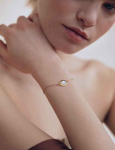 Orné d'un cabochon de nacre naturelle aux doux reflets irisés, le bracelet Lise incarne la simplicité sans être trop classique.