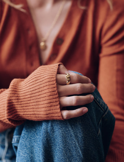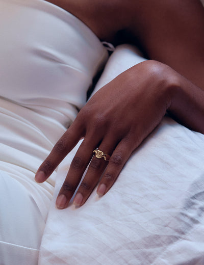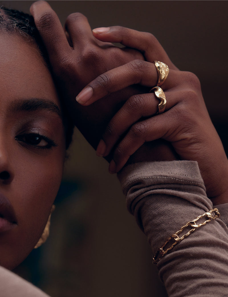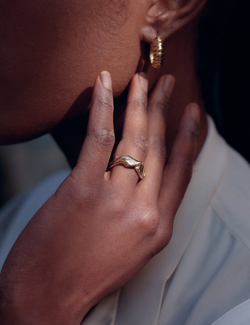 Modelé et sculpté à la main par Louise, le motif de cette bague nous rappelle le mouvement d'une étoffe humide que l'on serre entre nos mains. Une expérience visuelle mais aussi sensorielle.